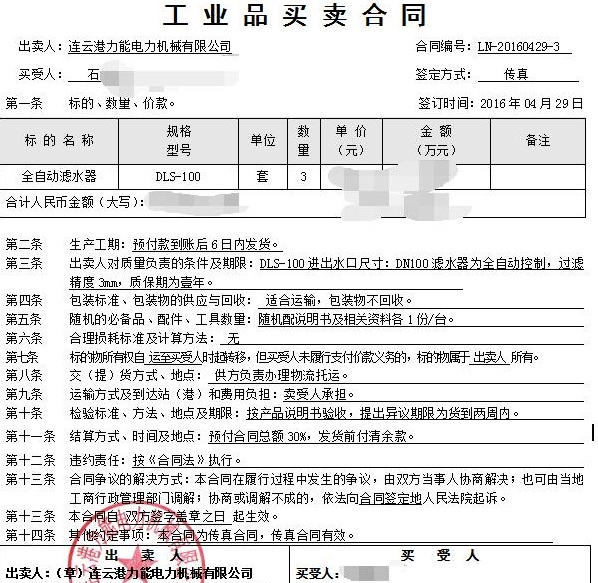 石女士購買全自動(dòng)濾水器DLS-100三套,感謝石女士對本公司的信賴!本公司將全力為顧客服務(wù),做一個(gè)讓客戶滿意的全自動(dòng)濾水器專業(yè)生產(chǎn)廠家。下面為簽訂的購買合同以及產(chǎn)品照片。