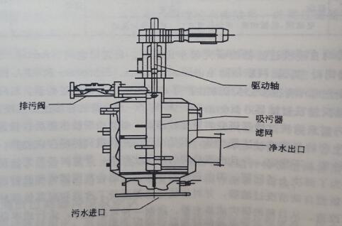 吸污式自清洗網式濾水器的自清洗是通過吸污嘴來實現的。吸污嘴與排污管連通,自清洗時,排污閥打開,使得吸污嘴與大氣相連通,在吸污嘴的兩側產生很大的壓差使吸污嘴產生強勁吸力,因此吸污式自清洗網式濾水器自清洗耗水量小且清洗效果好。由于吸污嘴不與濾網直接接觸,吸污式自清洗網式濾水器能夠有效地保護濾網,具有耐久的特點,同時自清洗機構具有結構簡單、運行可靠的優(yōu)點。吸污式自清洗濾水器如下圖所示。