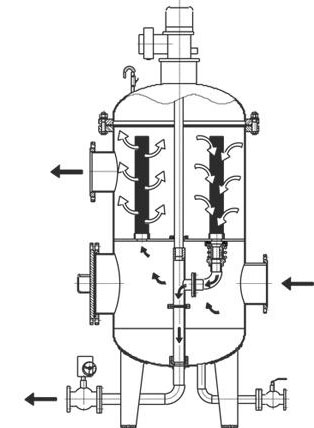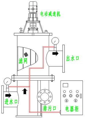 電動濾水器過濾工作原理圖如下右圖所示,水源從進水口進入電動濾水器,當(dāng)水中雜質(zhì)通過網(wǎng)芯時,雜質(zhì)