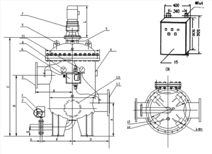 9-排氣螺釘 10-濾水器檢修口 11-進水口壓力表和管路 12-進水口法蘭 13-濾水器安裝支座 14.排污孔 15-電氣控制箱